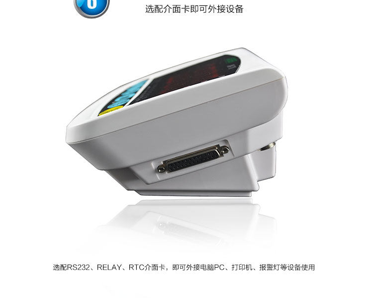 可选配RELAY、RS232含(RTC)介面,外接电脑、针式打印机、热敏标签打印机、三色警示灯